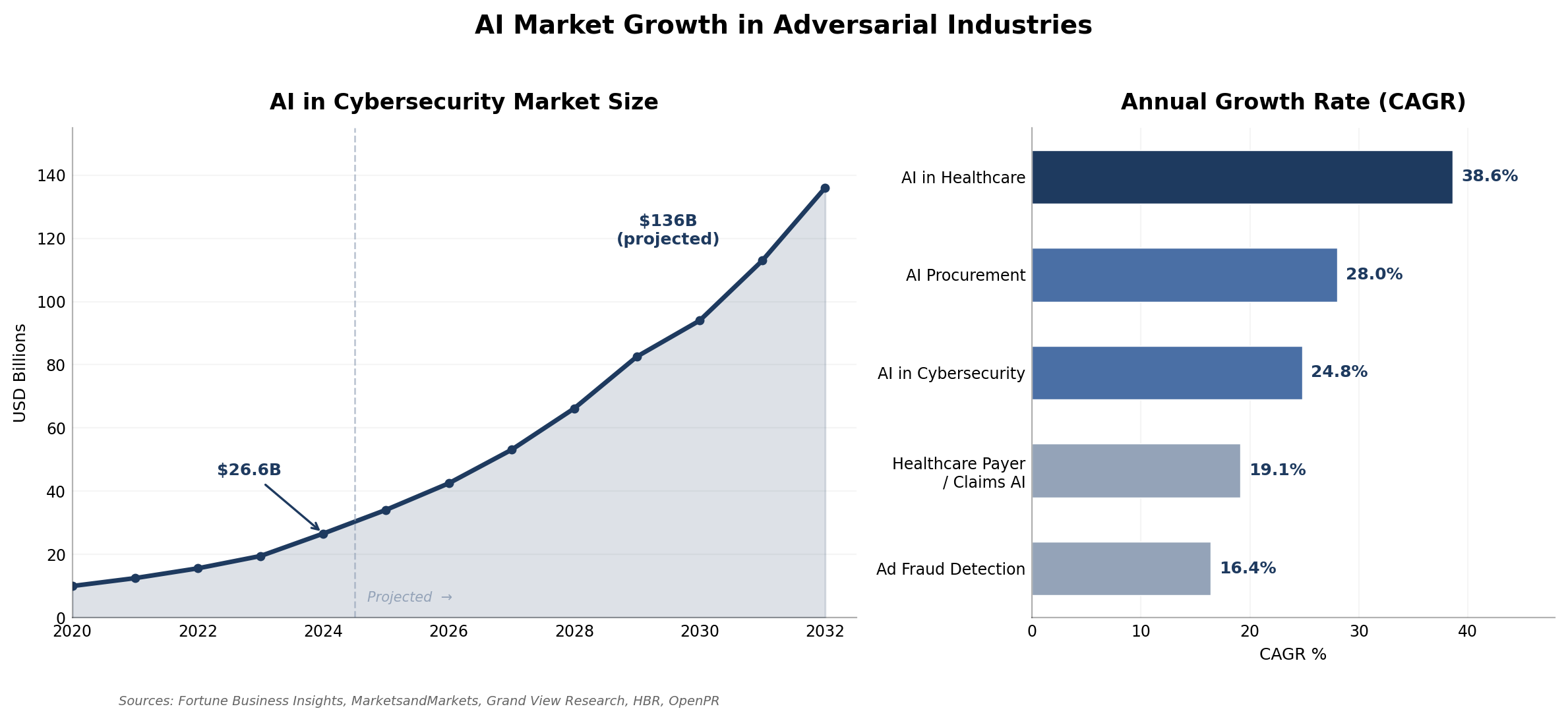 That healthcare dynamic isn't an anomaly - it shows up everywhere. Cybersecurity is the most obvious example: 82.6% of phishing emails now use AI language models, and the AI cybersecurity market is growing at nearly 25% annually because defenders have no choice but to keep pace with attackers. Litigation is another clear case. When one firm adopts AI tools that can process millions of documents in hours, opposing counsel can't afford not to match that capability.
